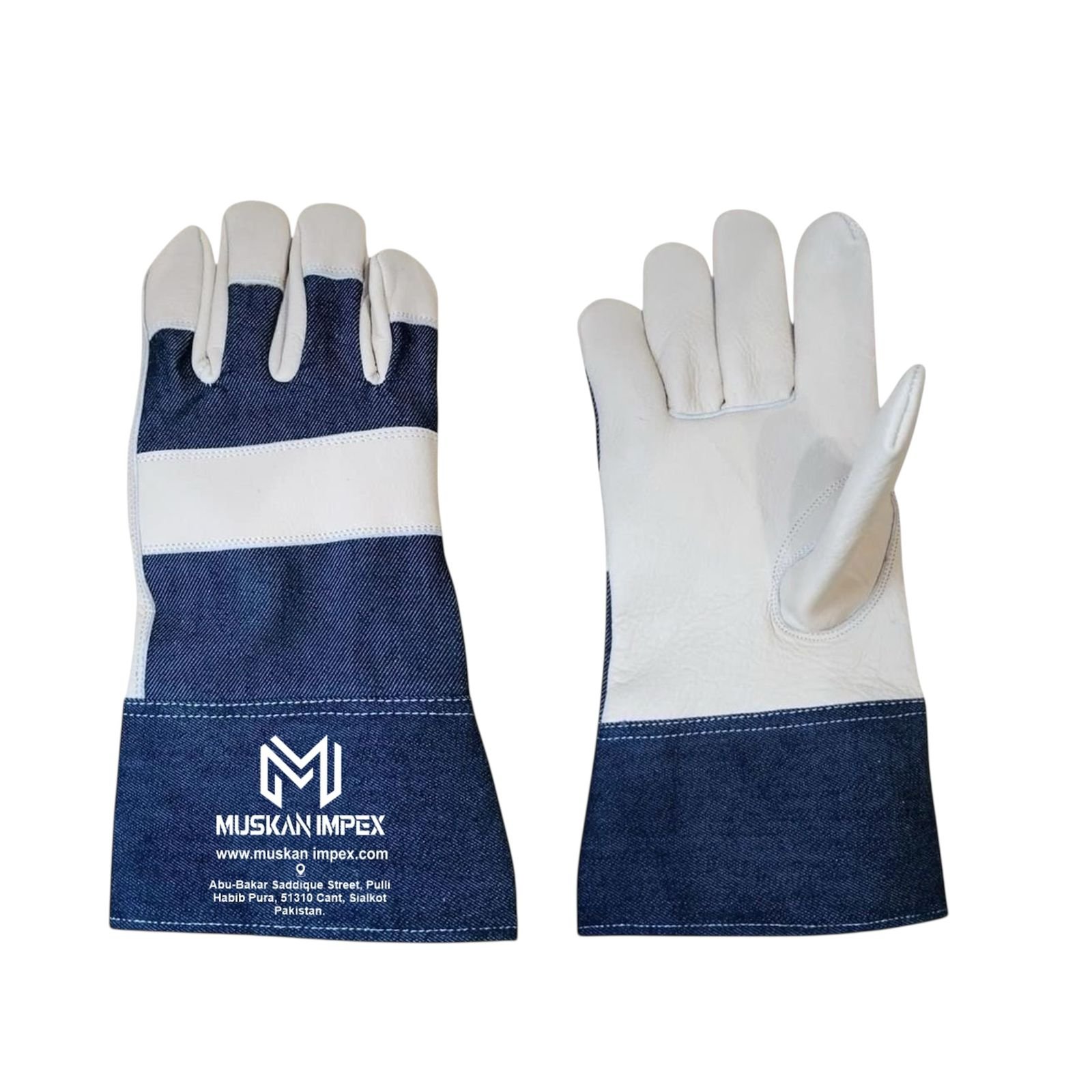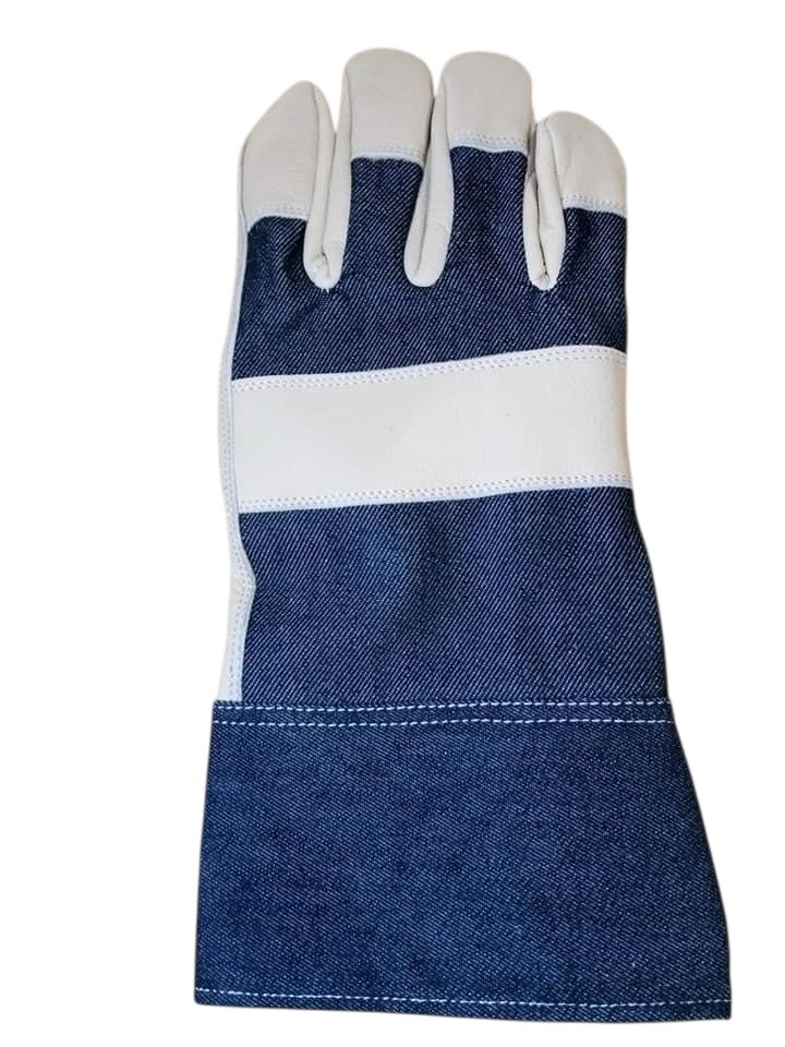Crafted for durability and comfort, the MI 162 glove features premium white leather with a blue jeans fabric cuff and back for enhanced flexibility and breathability. The glove is fully lined for added comfort and protection during extended use.
