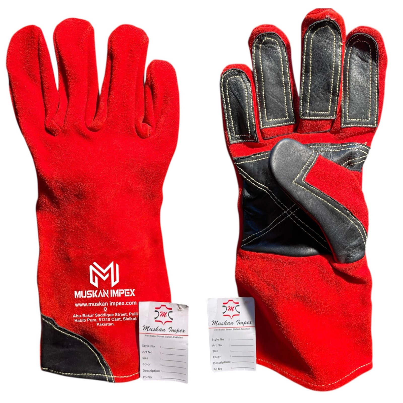The MI 177 MIG Welding Gloves by Muskan Impex are engineered for demanding industrial environments. Crafted from premium red cowhide split leather, these gloves feature black buffalo grain leather palms and finger reinforcements for enhanced durability and grip.