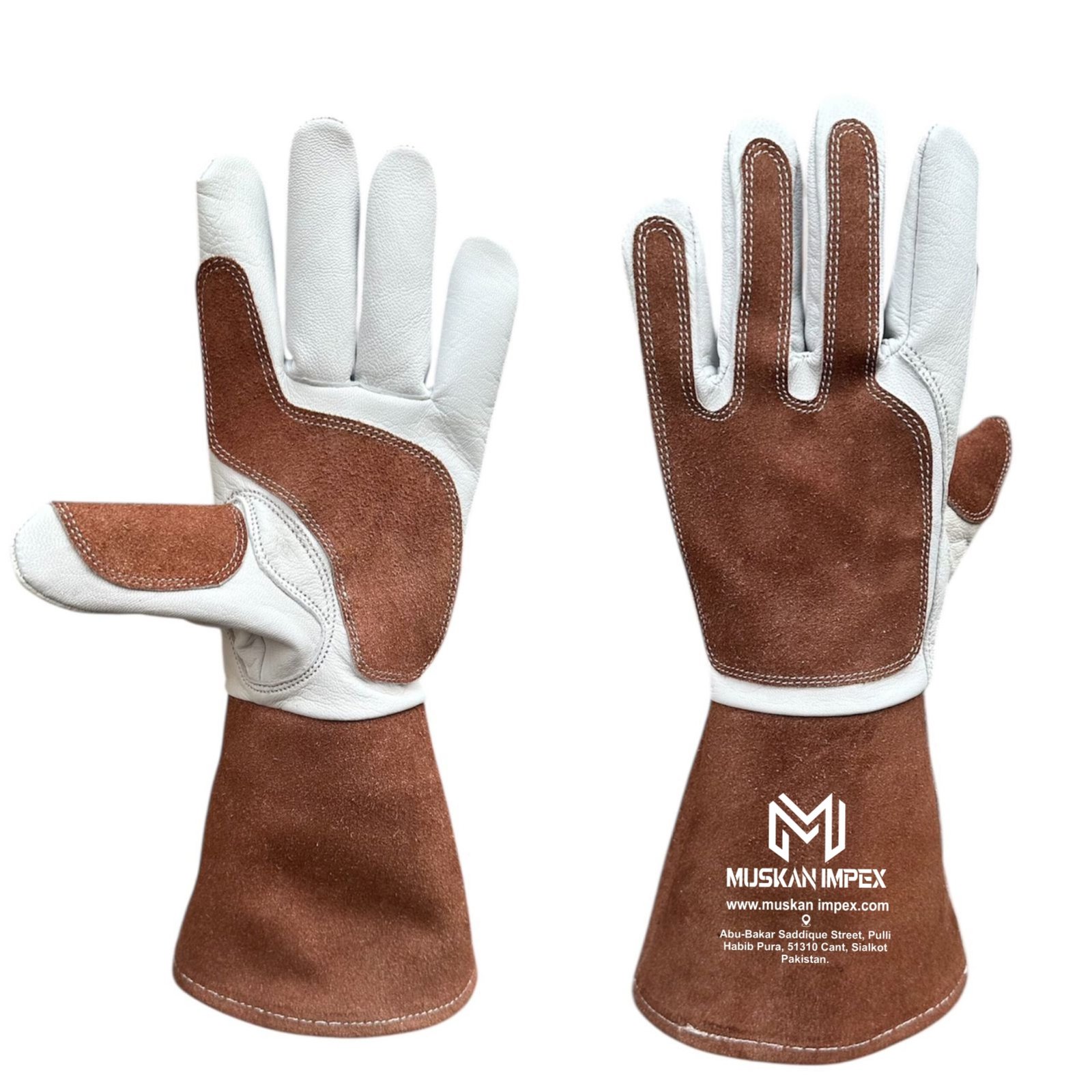 • Cuff & Protection: Brown cowhide split leather cuff with back finger heat protection