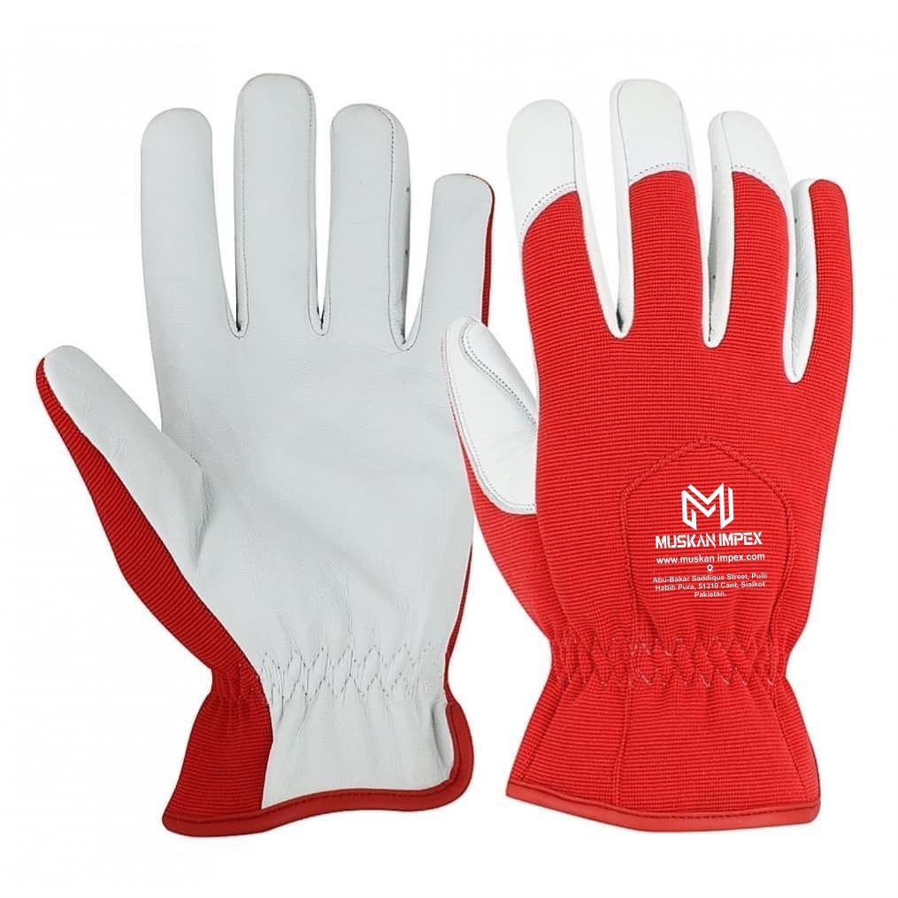 Crafted with premium white grain goat skin leather and a red polyester double elastic back, these gloves offer both durability and style. Designed with lightweight construction and fleece lining, they provide superior warmth and comfort, making them ideal for cold weather and winter applications.